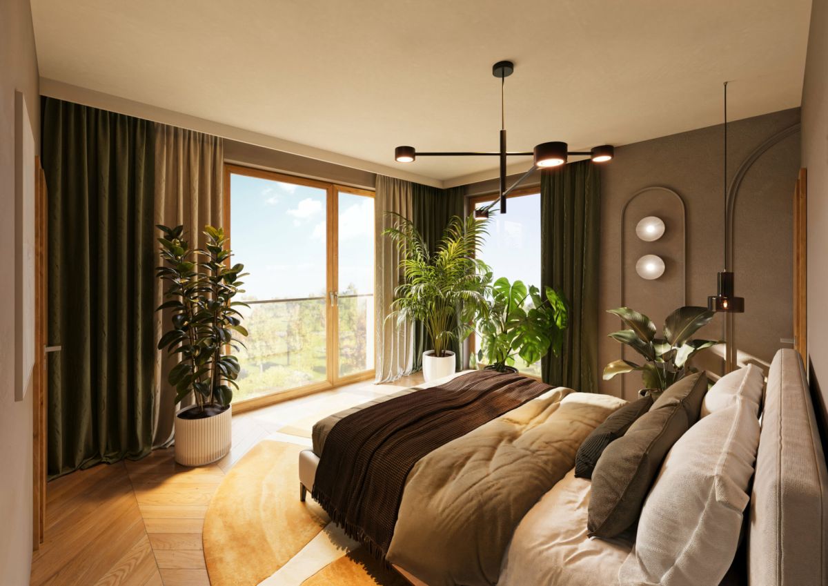 - Elegancka architektura domów zatopionych w zieleni, z wysokimi drewnianymi oknami i dopracowanymi detalami wykończenia, nadaje inwestycji prestiżowy i ponadczasowy charakter.