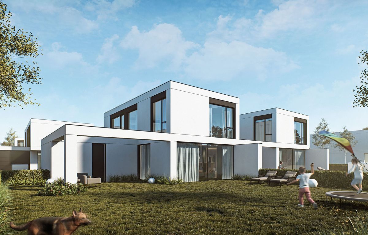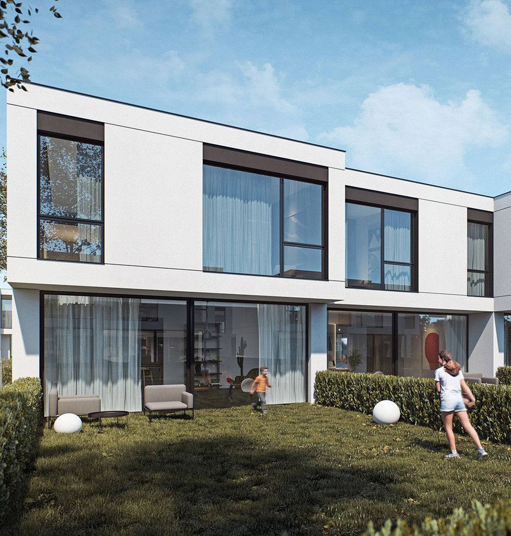 - Nowoczesna architektura oraz aluminiowe okna z dużymi przeszkleniami zapewniają jasne, dobrze doświetlone wnętrza.