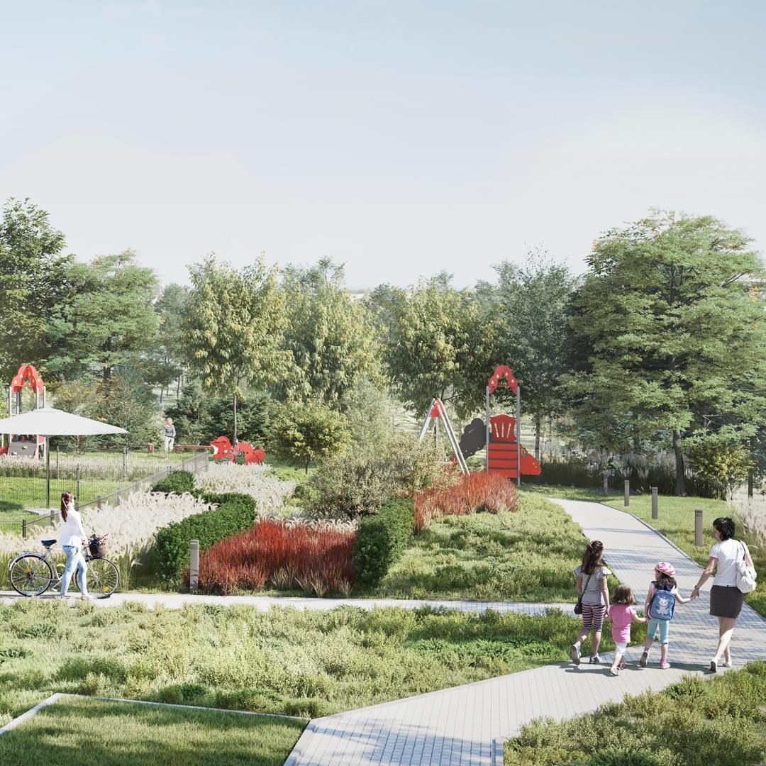 - Na terenie osiedla znajdą się ławki, skwery wyposażone w stojaki rowerowe, miejsce na ognisko oraz plac zabaw.