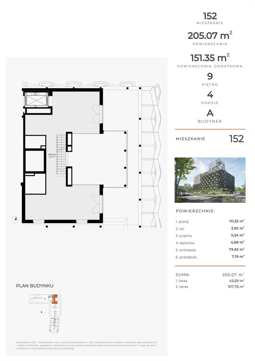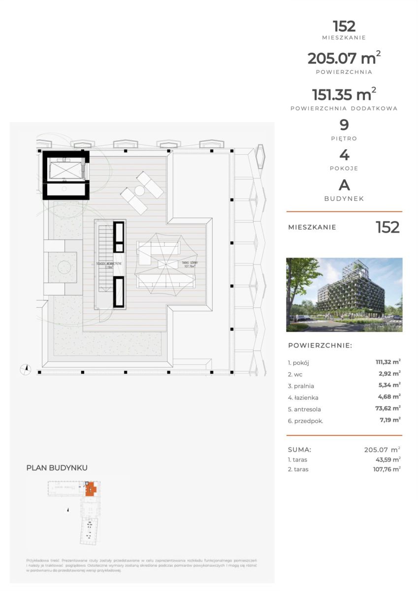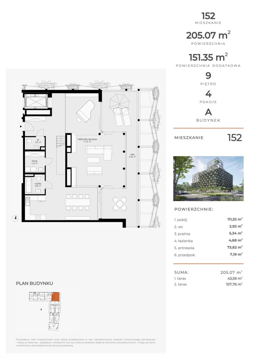 Apartament o powierzchni 205,07 m2 obejmuje przestronny pokój dzienny o powierzchni 111,32 m2, WC 2,92 m2, pralnię 5,34 m2, łazienkę 4,68 m2, przedpokój 7,19 m2 oraz antresolę 73,62 m2, oferując szerokie możliwości własnej aranżacji. Apartament uzupełniają taras o powierzchni 43,59 m2 oraz taras na dachu o powierzchni 107,76 m2.