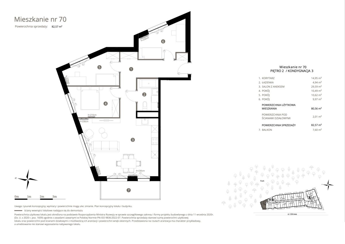 - Strefy wspólne obejmują prywatny park o powierzchni ponad 8000 m² z alejkami spacerowymi, strefami wypoczynku oraz przestrzeniami do aktywności, w tym strefą jogi i miejscem do treningu.
