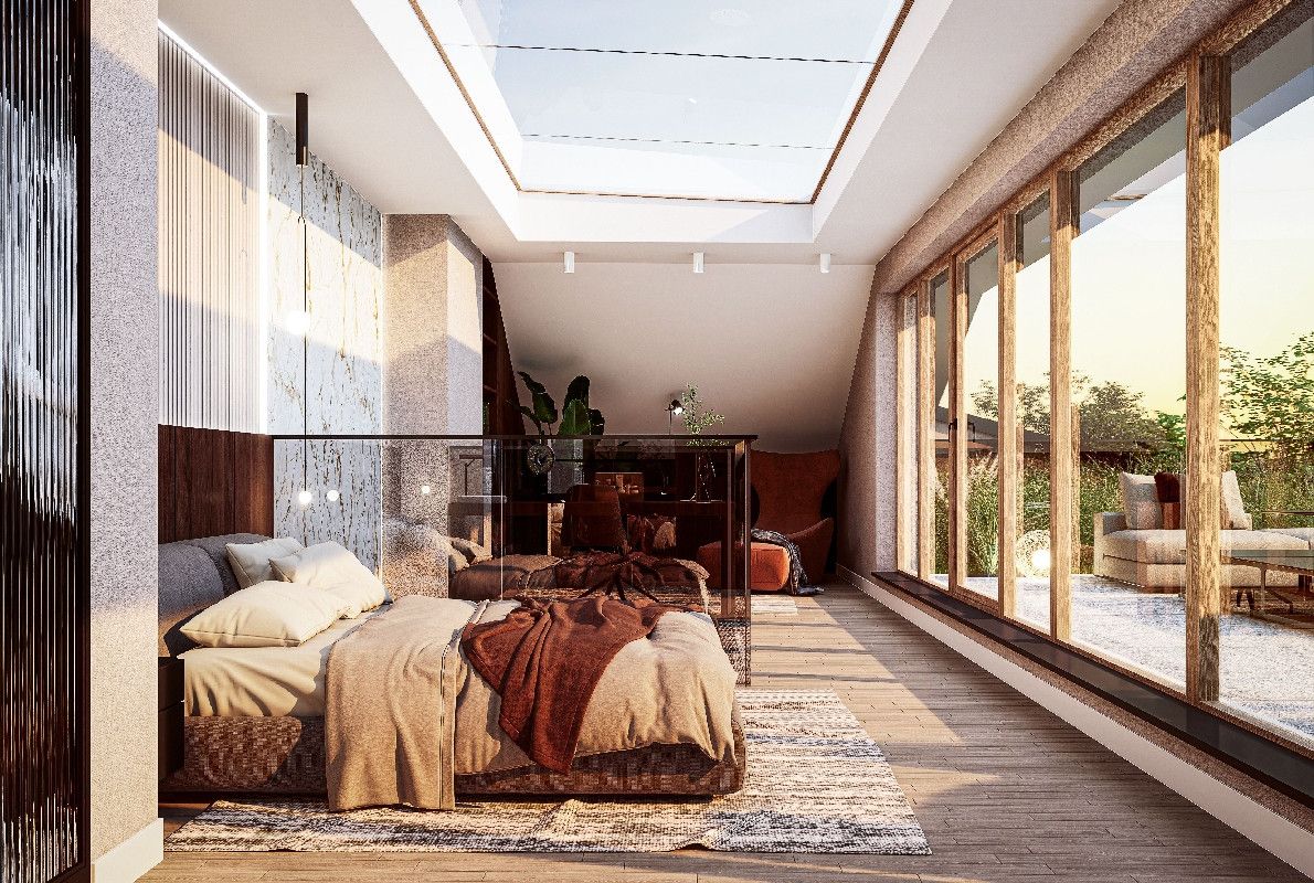 - Panoramiczne przeszklenia zapewniają bardzo dobre doświetlenie wnętrz oraz wzmacniają poczucie otwarcia na otoczenie.
